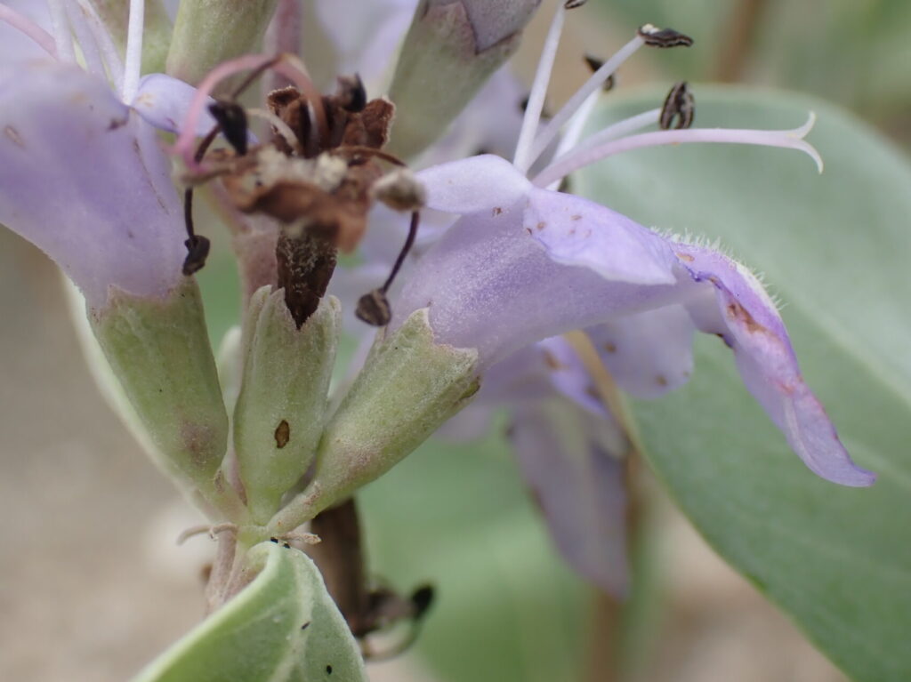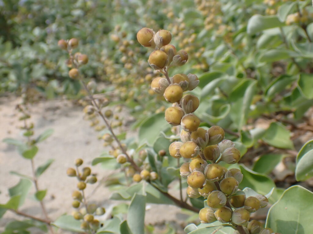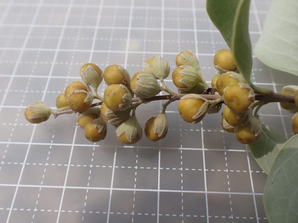 それはさておき、個人的に気に入ったのはハマゴウの果実である。特に熟す前の果実は、梨のような色と質感をしており、見た目も可愛らしい。そしてかなり硬い。手では押し潰せないほどである。核果ということで中の核を観察しようと思ったが断念した。(自宅にも持ち帰り忘れた。)図鑑には紅葉するとの情報も書かれていたので、次の機会に併せて確認したい。